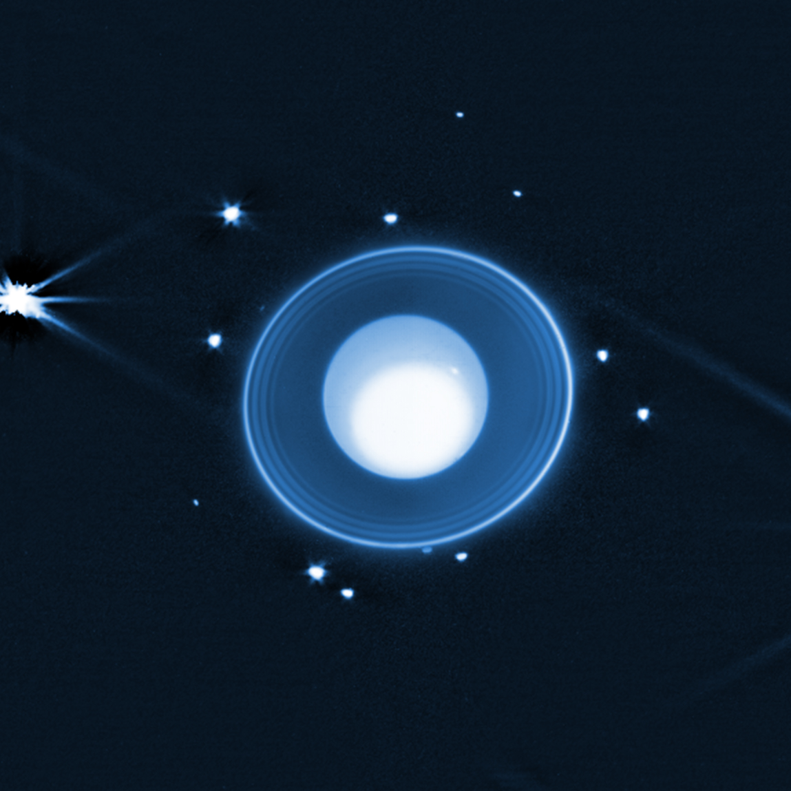 The new moon is the 14th member of the intricate system of small moons orbiting inward of the largest moons Miranda, Ariel, Umbriel, Titania, and Oberon. (All the moons of Uranus are named after characters from Shakespeare and Alexander Pope.)